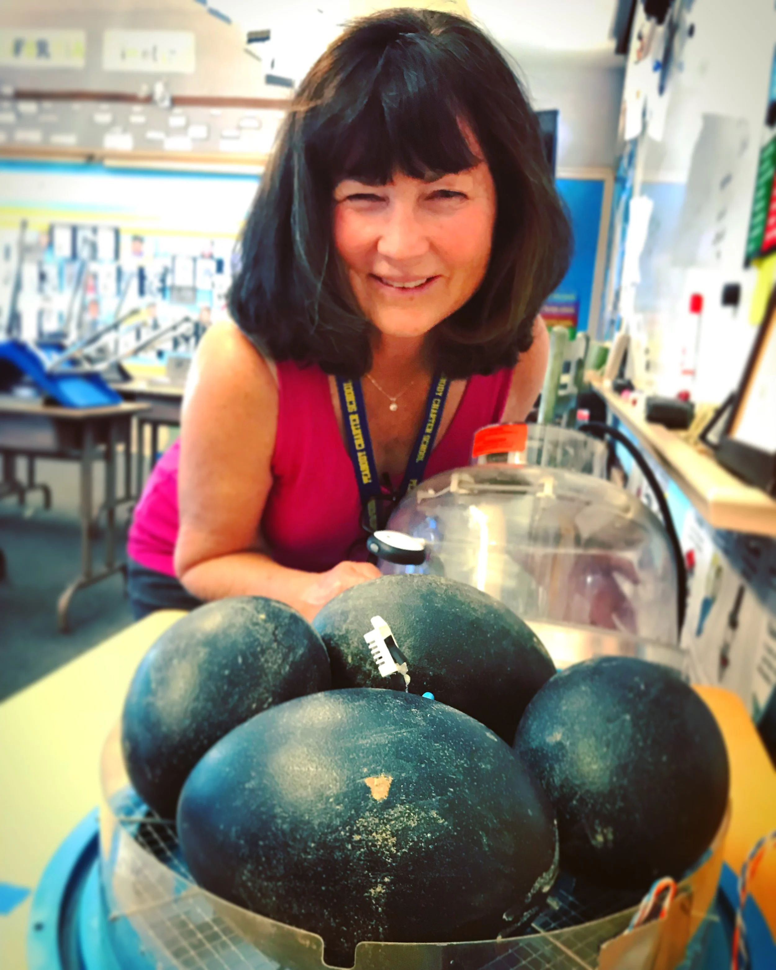 Mrs. Stirling at Peabody School with her incubating emu eggs.
